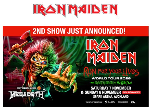 Due to overwhelming demand, IRON MAIDEN announce a second Auckland show has been added to the New Zealand leg of their ‘Run For Your Lives’ Tour on Sunday, 8 November at Spark Arena, with very special guests MEGADETH.